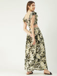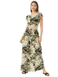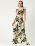 Features: square neck, short sleeves, crop top, ankle length, flared hem skirt, lightweight and all over printed pattern