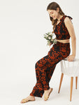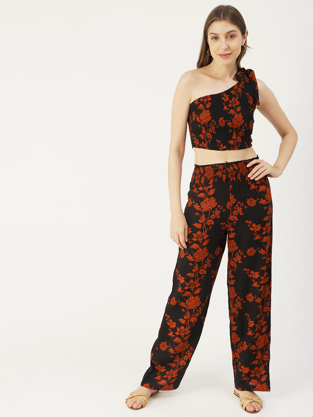 Features: one side tie-up shoulder, crop top, ankle length palazzo, elastic waist, lightweight and all over printed pattern