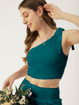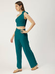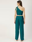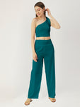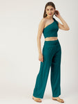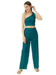 Features: one side tie-up shoulder, crop top, ankle length palazzo, elastic waist, lightweight and all over solid pattern