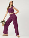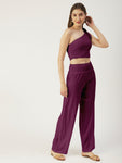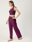 Features: one side tie-up shoulder, crop top, ankle length palazzo, elastic waist, lightweight and all over solid pattern