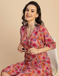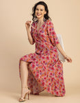 Features: V-Neck, Wrap Style, Ruffle Hem, Elbow Sleeve, Long Maxi Length, And All Over Printed Pattern