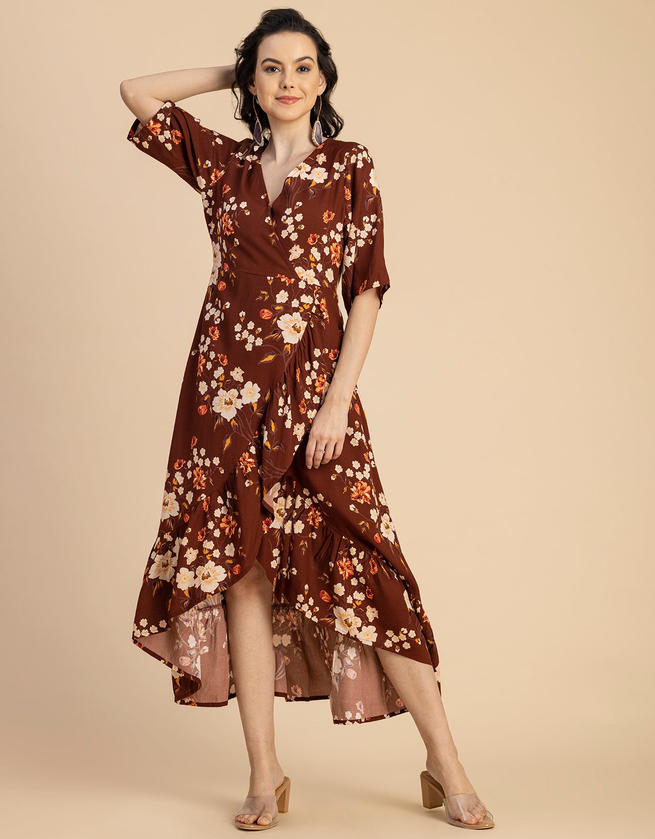Tags: Long Dress For Women, Ruffle Hem Asymmetrical Dress, Printed Maxi Dresses, V-Neck Dress, Printed Dresses For Women,