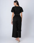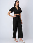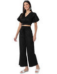 Features: This V-neck 2-Piece Cotton Co-ord Set features a stylish crop top with puffed sleeves and elastic detailing on the front and back, paired with flared palazzo pants that have an elastic waist with a drawstring, offering a relaxed fit, lightweight comfort, and two convenient pockets.
