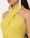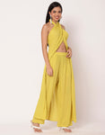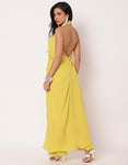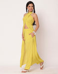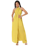 Features: A elegant chic halter top with a front slit and back zipper closure for a bold yet sophisticated look, elastic-waist pants with pockets for style and practicality, perfect for parties, festive celebrations, or as a stylish resort outfit.