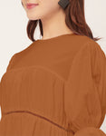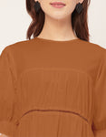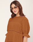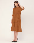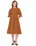 Features: Round Neck, Knee Length, Short Puff Sleeves, Tiered Dress With Lace Work, Relaxed Fit.
