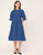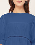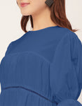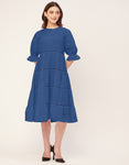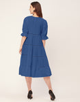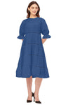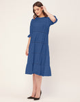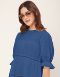 Features: Round Neck, Knee Length, Short Puff Sleeves, Tiered Dress With Lace Work, Relaxed Fit.