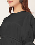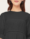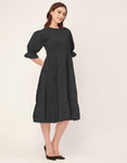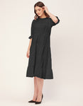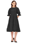 Features: Round Neck, Knee Length, Short Puff Sleeves, Tiered Dress With Lace Work, Relaxed Fit.