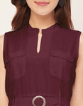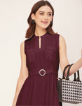 Features: Mandarin Collar, Includes 2 Pockets, Sleeveless, Zip Closure, Knee Length, Regular Fit Dress With Belt.