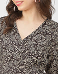 Features: V-Neck, Wrap Style, Ruffle Hem, Quarter Sleeve, Short Length, And All Over Printed Pattern