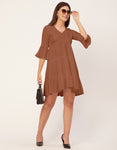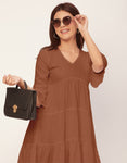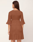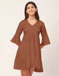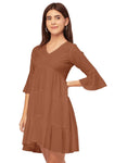 Tags: Tiered Dress For Women, V Neck Dresses, Solid Dress For Women, Midi Dress For Women, Casual Dress, Bell Sleeve Dress,