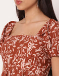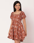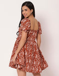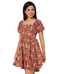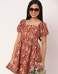 Features: Short puff sleeves side zipper square neck flared hem short length lightweight and all over printed pattern