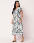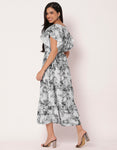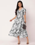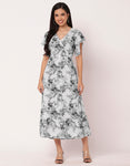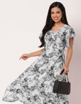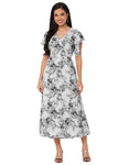 Features: Ruffled, short sleeves, v-neck, tiered, calf length, conceal zipper, lightweight and all over printed pattern