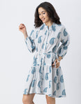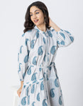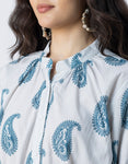 Features: Full Sleeve, Band Collar, Plastic Button On Front, Drawstring, Regular Length, Lightweight, All Over Printed Pattern.