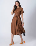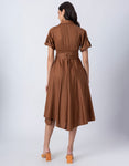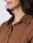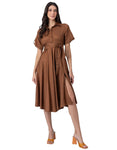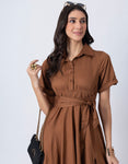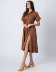 Features: Dress featuring a chic side leg slit and classic collar with buttons. The smocked back waist ensures a flattering fit, complemented by a long wrap belt and rolled sleeves for a versatile look. Perfect for the modern girl boss.