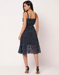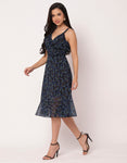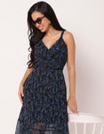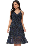 Features: Strap shoulder, sleeveless, v neck with ruffle, regular fit, flared hem, lightweight and all over printed pattern.