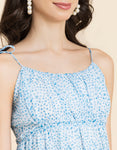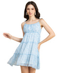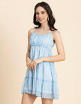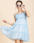 Features: Strappy Shoulders, Tiered, Round Neck, Flared, Short Length, Lightweight And All Over Printed Pattern
