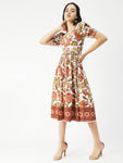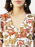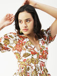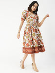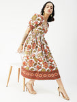 Features: puff sleeves, flared hem, V neck, high waist, long length, lightweight and all over printed pattern