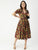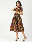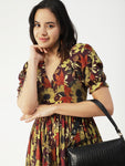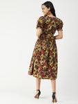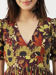 Features: puff sleeves, flared hem, V neck, high waist, long length, lightweight and all over printed pattern
