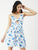 Features: strap shoulders, sleeveless, front tie-up knot, front buttoned, flared hem, V neck, high waist, knee length, lightweight and all over printed pattern