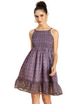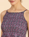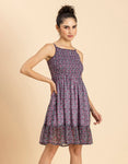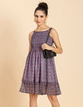 Features: Strappy Shoulders, Smocked Bust, Sleeveless, Square Neck, Frilled Flared Bottom, Mini Length, Lightweight And All Over Printed Pattern