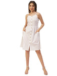 Features: sleeveless, strap shoulders, button down, round neck, knee length, front pockets, lightweight