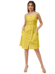 Features: sleeveless, strap shoulders, button down, round neck, knee length, front pockets, lightweight