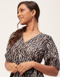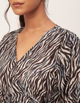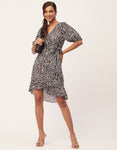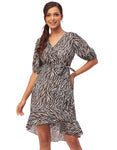 Features: Short Sleeve, Ruffle Style, V-Neck, Asymmetric, Wrap Style With Fabric Belt, All Over Printed.