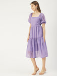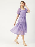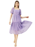 Features: elbow sleeves, tiered hem, square neck, smocked, calf length, lightweight and all over Solid pattern