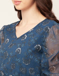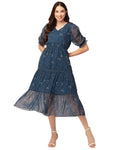 Features: Side Zipper Puffed Elbow Sleeves V Neck Tiered Hem Calf Length Lightweight And All Over Printed Pattern