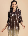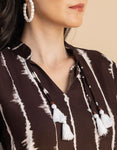 Features: 3/4Th Sleeve, Mandarin Collar, Tassels Detail, Loose Fit, High Low Hem, Knee Length, Loose Fit Lightweight And All Over Printed Pattern.