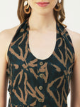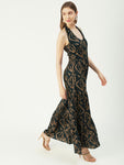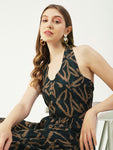 Features: deep halter neck, sleeveless, front buttoned, high waist, flared bottom, lightweight and all over printed pattern