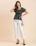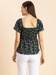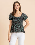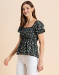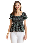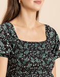Features: Puffed Elbow Sleeves, Square Neck, Smocked Bust, Ruffled, Waist Length, Lightweight And All Over Printed Pattern