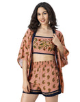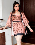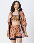Features: Spaghetti Strap Crop Top With Smocked Back, Elastic Waist Shorts That Includes 2 Pockets, Matched With Shrug Coverup, Lightweight, Regular Fit, All Over Printed Pattern.