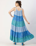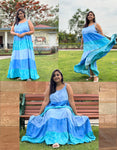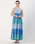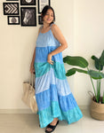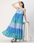Features: Round Neck, 6- Tiered Dress, Sleeveless, Maxi Length, Summer Beach Dress, Flared, Lightweight, Tie Dye Printed Pattern, Perfect Beach Vacation Dress.