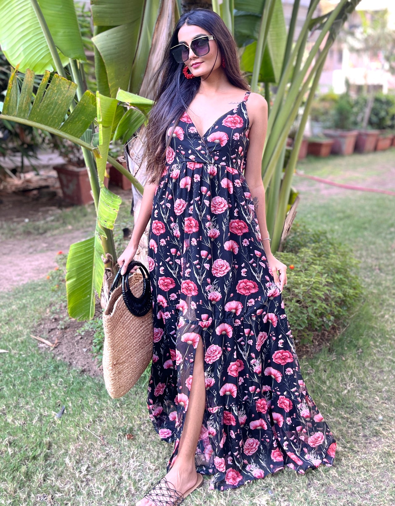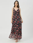 Features: Spaghetti Strap, V-Neck, Tiered Style, Flared Hem, Maxi Length, Relaxed Fit, Lightweight And All Over Printed Pattern.