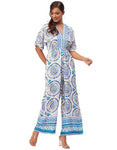 Features: Short Sleeves, V-Neck, Loose Fit, Wide Leg, Lightweight, All Over Printed Pattern.