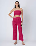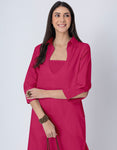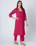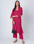 Features: Loose-fit long kurta with a classic collar, full sleeves, and pockets, paired with an off-shoulder smocked inner top and elastic waist bottom pants. A stylish 3-piece designer cotton slub outfit, perfect for an Indo-Western look, complete with pockets for added convenience.