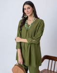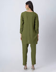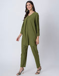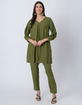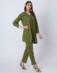 Features: Solid V-neck kurta with an inverted pleat design, broad cuff sleeves, and pockets on both sides, paired with elastic waist pants. A stylish and comfortable coord set perfect for a versatile look.