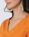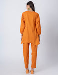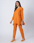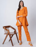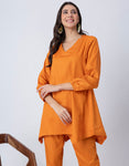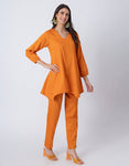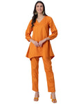 Features: This Cotton Slub Co-ord Set features a V-neck long sleeve kurta with a stylish high-low hemline, adorned with silver thread embroidery on the neck, paired with relaxed-fit pants that have an elastic waist and convenient pockets for added comfort.