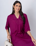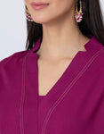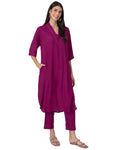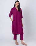 Features: Loose-fit quarter-sleeve kurta with pockets, featuring a V-neck with intricate Zari detailing. Paired with elastic waist pants, this set is crafted from soft viscose rayon for a comfortable yet stylish look.
