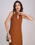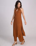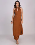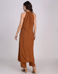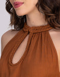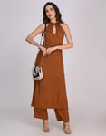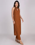 → Sleeveless halter neck kurta with braided neckline, adding a contemporary touch.