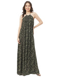 Features: Sleeveless, Halter Neck, Spaghetti Strap, Flared Hem, Long Maxi Length, Resort Style And All Over Printed Pattern.