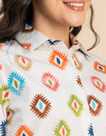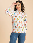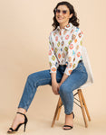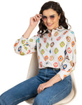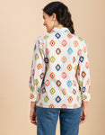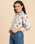 Features: Long Puff Sleeves, Shirt Collar Neck, Plastic Button, Regular Length, Regular Fit, Lightweight, All Over Printed Pattern.