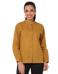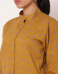 Features: Shirt band collar neck, long sleeves, full length, front button placket, lightweight and all over printed pattern