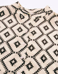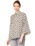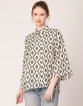 Features: Front Buttoned, Long Bell Sleeves, Collared Neck, Regular Sized, Light Weighted And All Over Printed Pattern