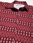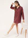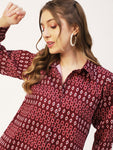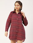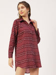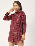 Features: collared neck, long sleeves, above knee length, buttoned down, loosely- fitted, lightweight and all over printed pattern