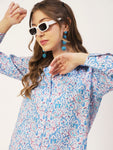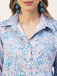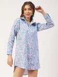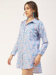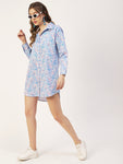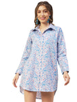 Features: collared neck, long sleeves, above knee length, buttoned down, loosely- fitted, lightweight and all over printed pattern