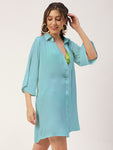 Features: collared neck, loose 3/4th sleeves, thigh length, buttoned down, loosely- fitted, lightweight, slightly sheer and solid pattern