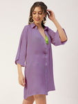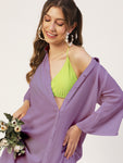 Features: collared neck, loose 3/4th sleeves, thigh length, buttoned down, loosely- fitted, lightweight, slightly sheer and solid pattern