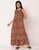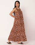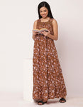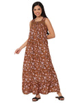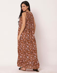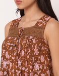 Features: Sleeveless, square neck, lace work on yoke, frill flared hem, printed pattern on all over.